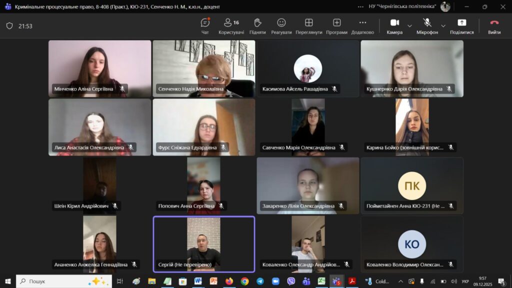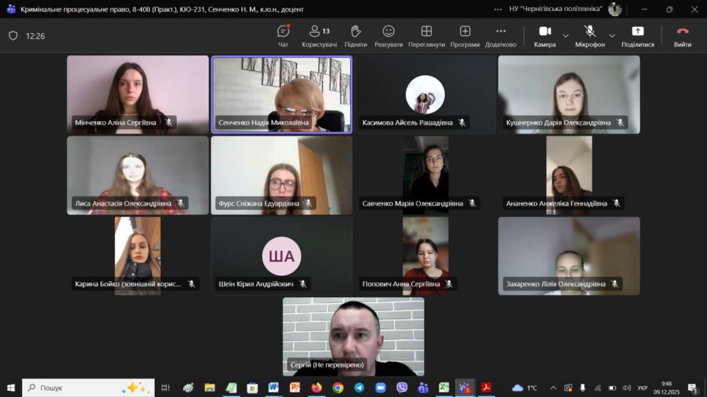 9 грудня 2025 року у межах вивчення дисципліни «Кримінальне процесуальне право» (викладачка к.ю.н., доцент Н. М. Сенченко) для студентів групи КЮ-231 була проведена гостьова лекція на тему: «Огляд місця події як невідкладна слідча (розшукова) дія».